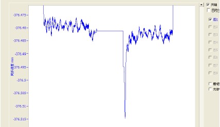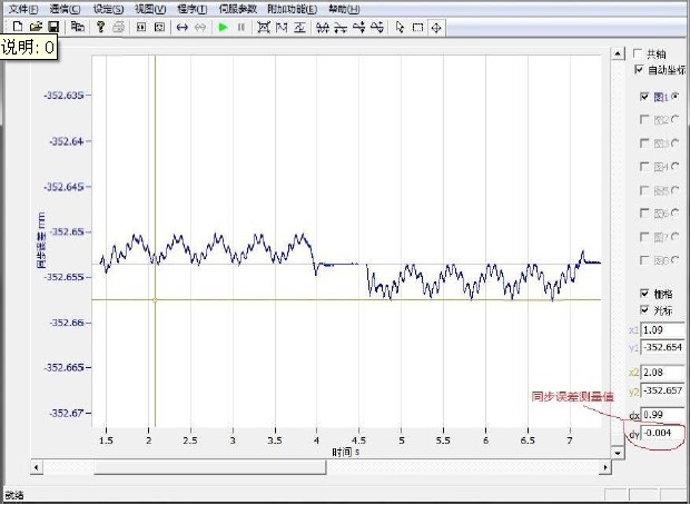 ?8) 單擊開始采樣(請(qǐng)確保此時(shí)NC正在運(yùn)行剛性攻絲程序),得到剛性攻絲同步誤差圖如下: