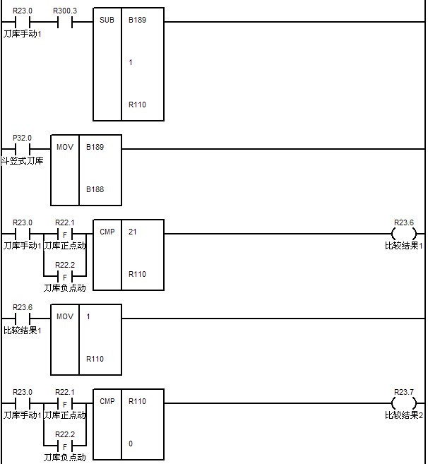 ????? M34的實現與M33類似,通過檢查F寄存器0組第8,9,10,11位可以檢查預設定的機床第二,三,四,五參考點。另外也可以根據需要寫出相似的代碼用來檢查每個運動軸的參考點。
