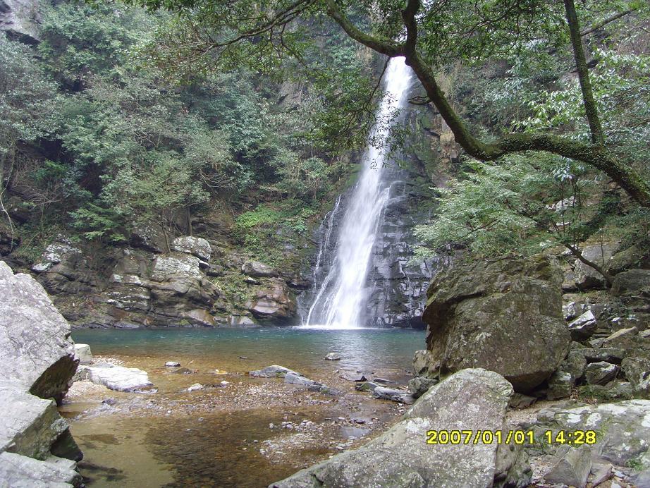 從黃洋界下山,我們慕名來到久負盛名的龍潭瀑布群,亦稱“五龍潭”,這是井岡自然風景最為壯觀佳綺麗的地區之一。五龍潭共有五潭五瀑,從上到下第一潭名碧玉潭,潭上有碧玉瀑,上窄下寬,凌空飛瀉,落差達67米,是五瀑中最高的一個,下落深潭,潭水碧綠,清澈晶瑩,猶似碧玉。第二潭名金鎖潭,潭上有鎖龍瀑,古名黃龍瀑。第三潭名珍珠潭,潭上有珍珠瀑,瀑水從30米高的陡崖上飛下,中間遇一巨石阻擊,水花飛濺,如噴珠吐玉。第四潭名飛鳳潭,潭上有飛鳳瀑急流直下,如鳳凰展翅,飛入潭中。第五潭名玉女潭,潭上有玉女瀑,似一窈窕少女,正在翩翩起舞,真是惟妙惟肖。再往下有紅軍洞,洞內能容百余人,在當年反圍剿斗爭中,曾住過紅軍傷病員,今遺跡仍在。