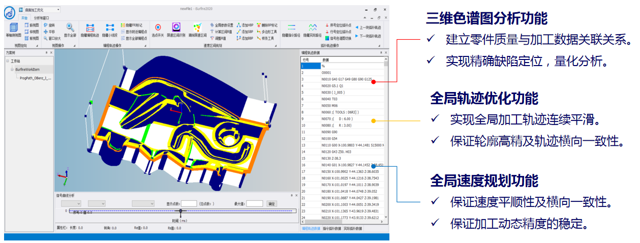 智優(yōu)曲面(iSurfine)軟件是華中數(shù)控系統(tǒng)配套的曲面加工優(yōu)化的專用軟件,具備加工數(shù)據(jù)色譜分析、全局軌跡平滑和速度橫向優(yōu)化功能,助力系統(tǒng)實現(xiàn)高速高精加工,提升產(chǎn)品加工效率及表面質(zhì)量。智優(yōu)曲面—三維色譜分析功能iSurfi...